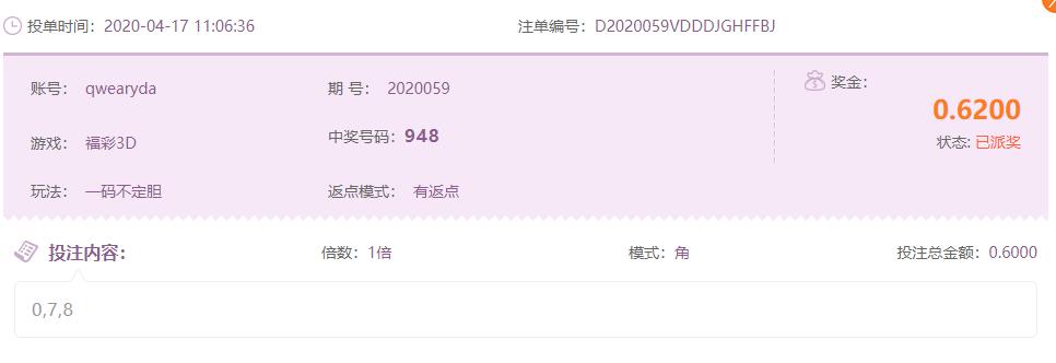 福彩3D中了一个