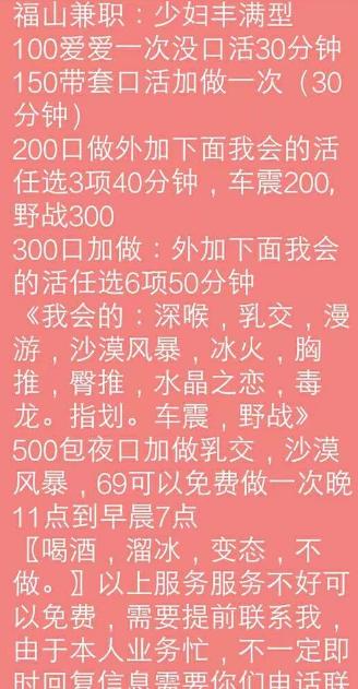 以上信息为网友分享,请在消费时自行判断谨慎消费。出现虚假信息和诈骗信息请站内短信给艾欧利雅:方法一:点击给艾欧利雅发短信——方法二:点击给艾欧利雅发短信 【寻欢时间】:2017.8.27 【寻欢地点】:福山 【信息来源】:朋友介绍 【服务项目】:该有的都有! 【妹妹数量】:1 【环境设备】:自己租的房子! 【营业时间】: 【价格一览】:200-300-500 【安全评估】:99 【服务星级】:★★★★ 【重点推荐】:RJ RJ RJ重要的事情说三遍! 【联系方式】: 【寻欢细节】:小狼是路过一朋友说起来了,手里面有个巨乳F杯,就是长的一般,小狼有点巨乳控一听立马要过联系方式了。电话联系有空驱车赶到,姐给发的价目表重要的一点能车震能车震能车震,重要的事情说三遍,小狼特别想试试这刺激玩法,可惜车上有行车记录仪怕,你懂得...小狼做了个300的,那个KJ和RJ一起真是让我飘飘欲仙,大姐是属于丰满型的,那一身软乎乎的肉真爽,那一对真的是软!喜欢大胸的真的可以试试! 【附带照片】:图我有不知道怎么传啊 【验证截图】: