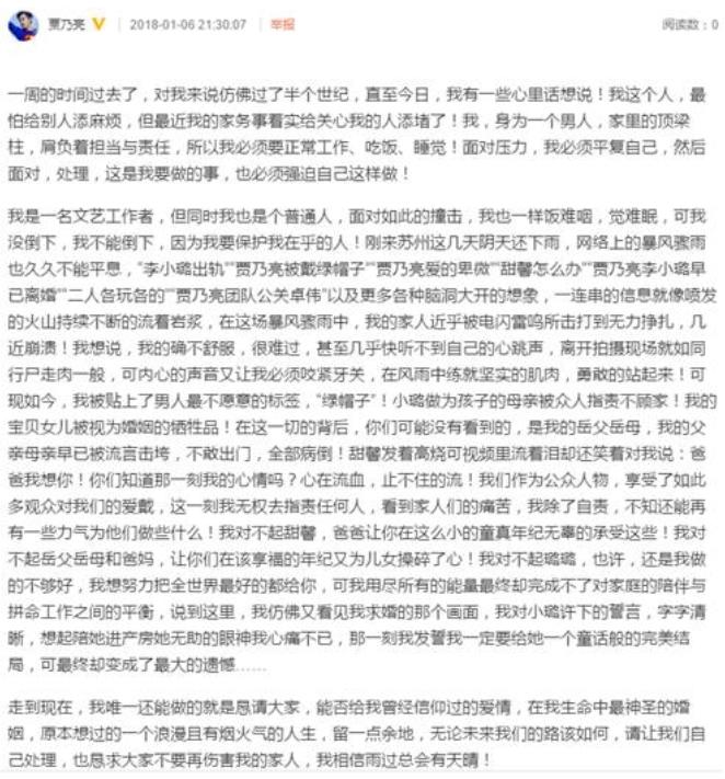 在2018年1月6号的深夜九点多,贾乃亮发了长长的一篇文章,把这一段时间的心里承受的压力,痛苦,和引李小璐和PGONG之间“夜宿门”事件的传言所带来的压力痛苦,字字泣诉,让人看了心酸!