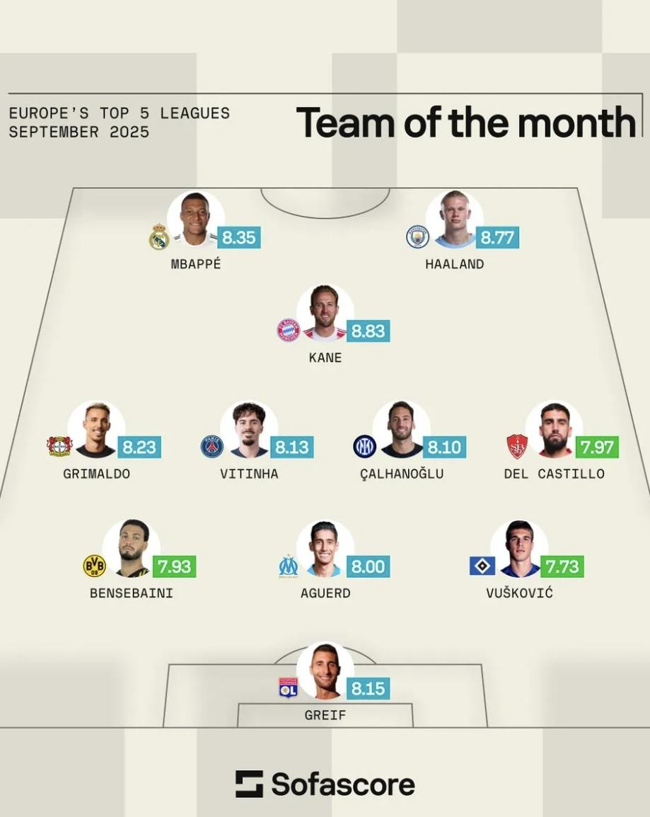 [|心得交流] Sofascore9月五大联赛最佳阵容:凯恩/姆巴佩/哈兰德在列 |