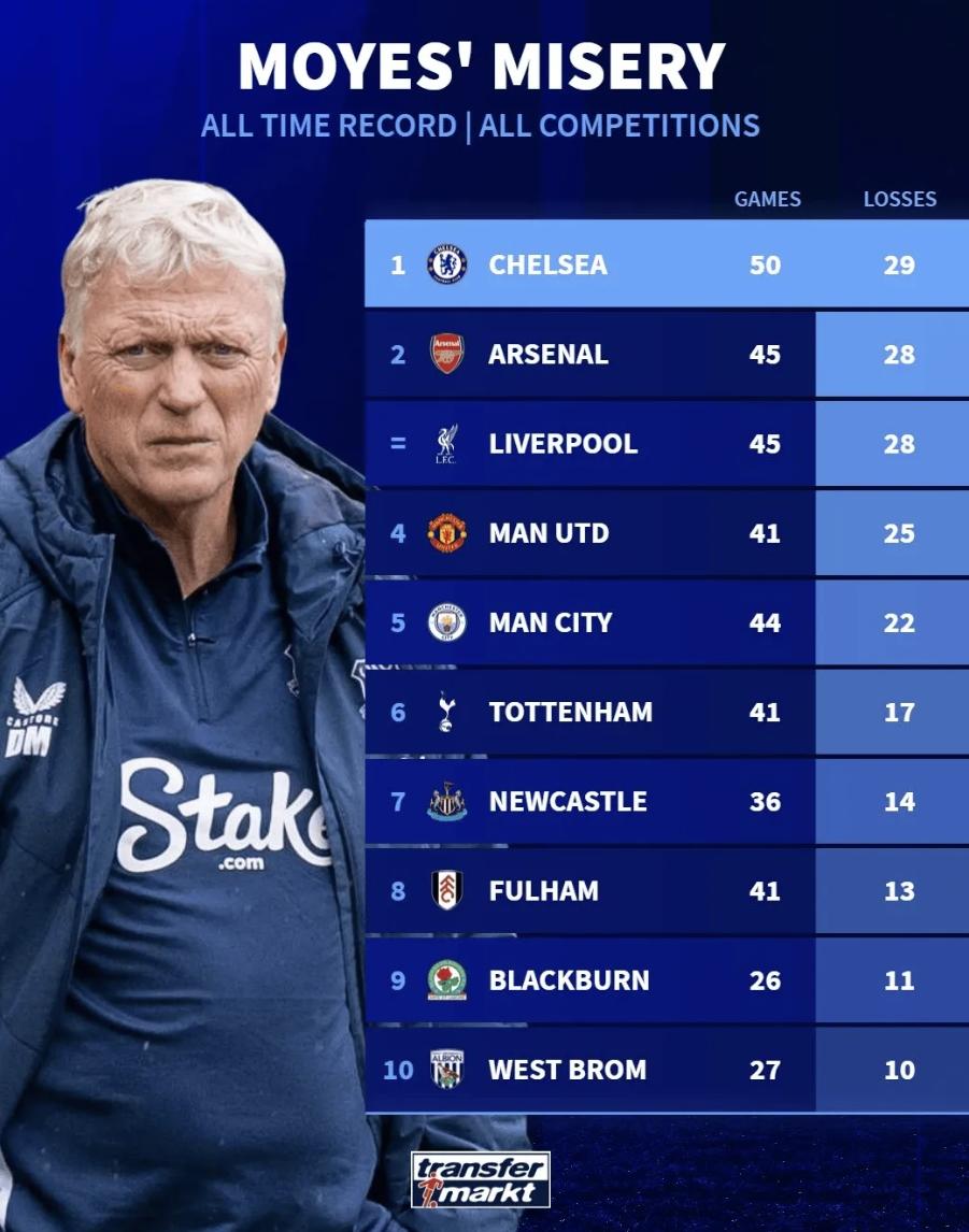 [|心得交流] 莫耶斯执教生涯输球对手榜:切尔西居首,枪手红军次席 |