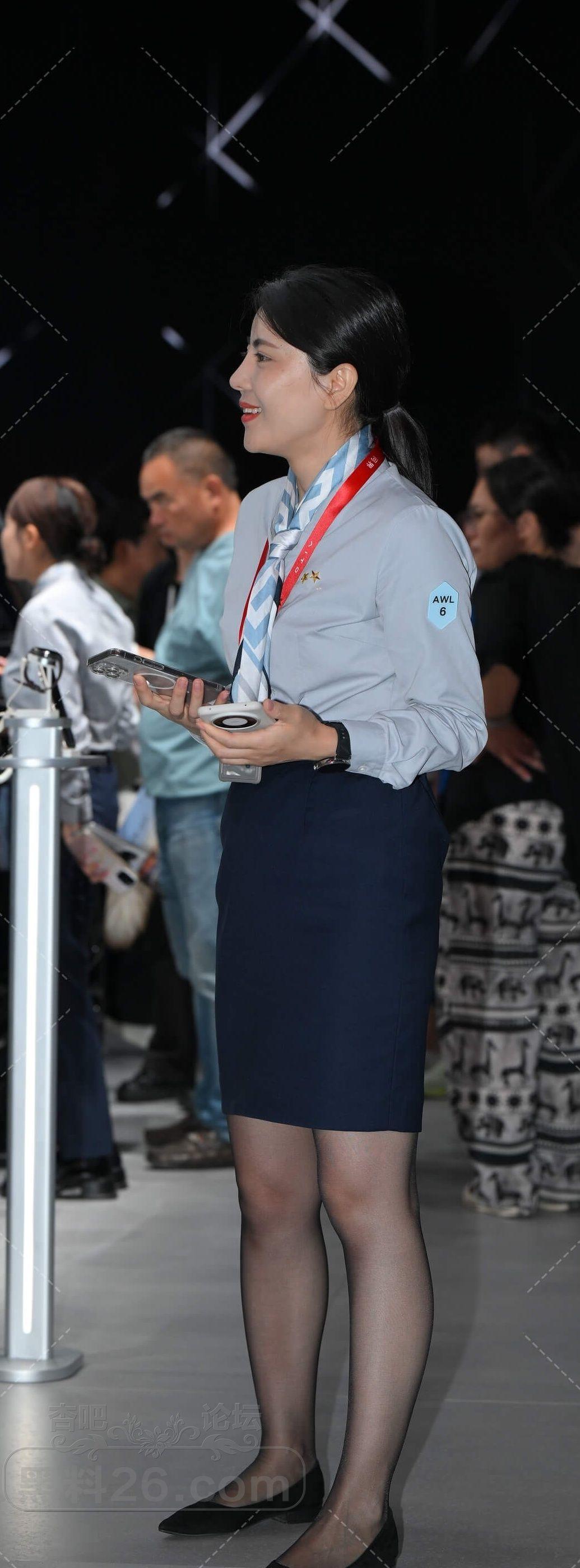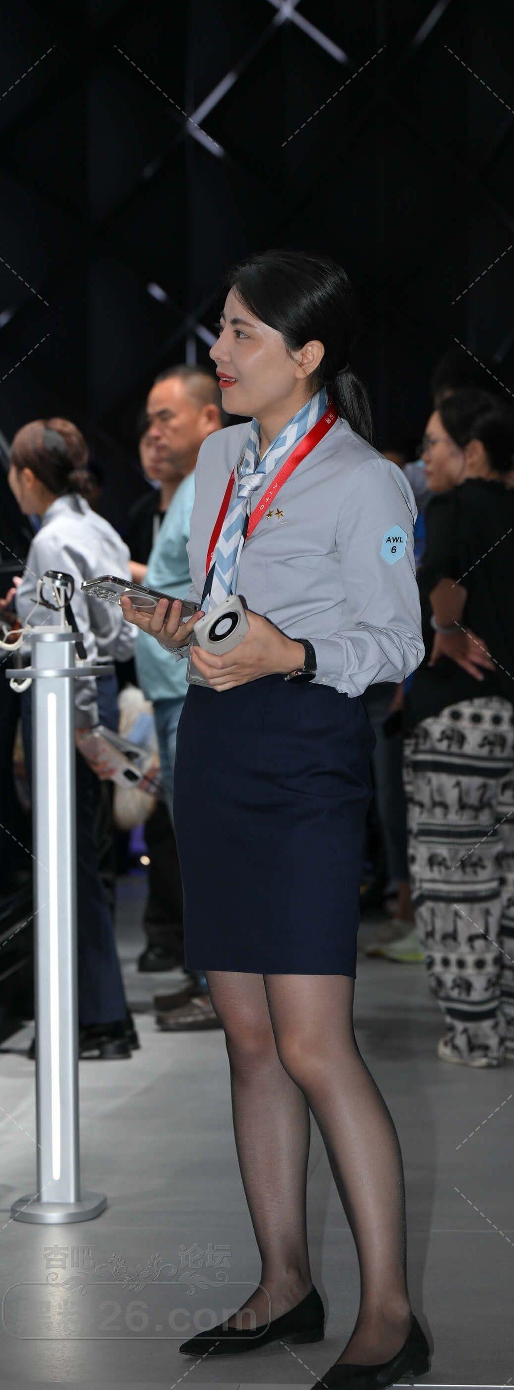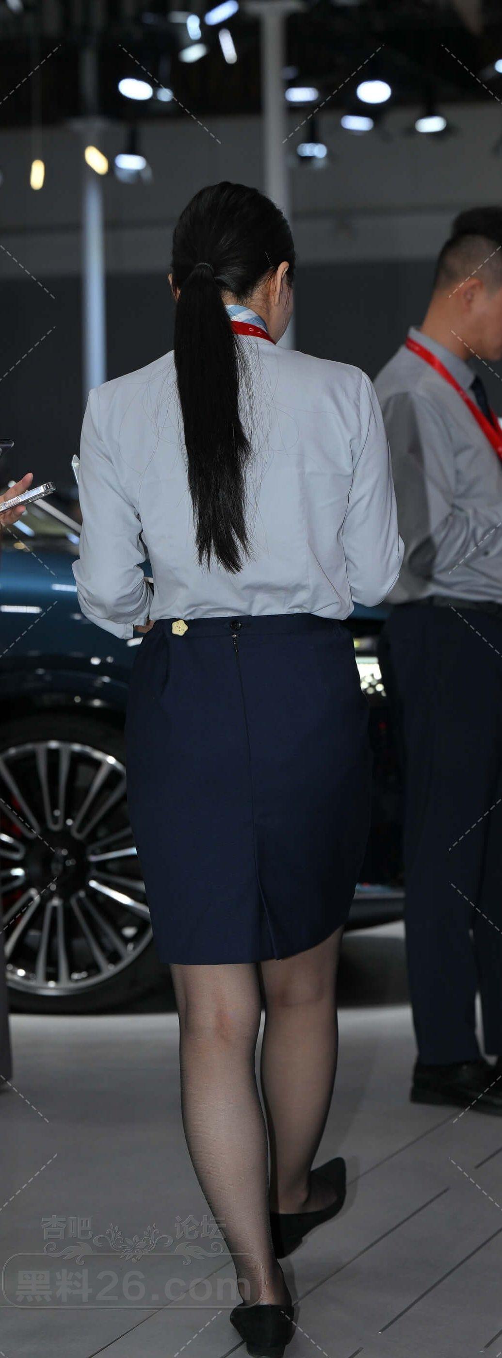 蓝色长袖衫深色短裙马尾美女售车员车展会上忙碌【10P】